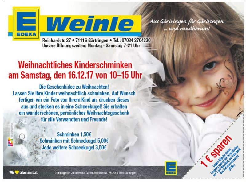 Weihnachtliches Kinderschminken am Samstag, 16.12.2017, von 10-15 Uhr im EDEKA Markt Weinle.